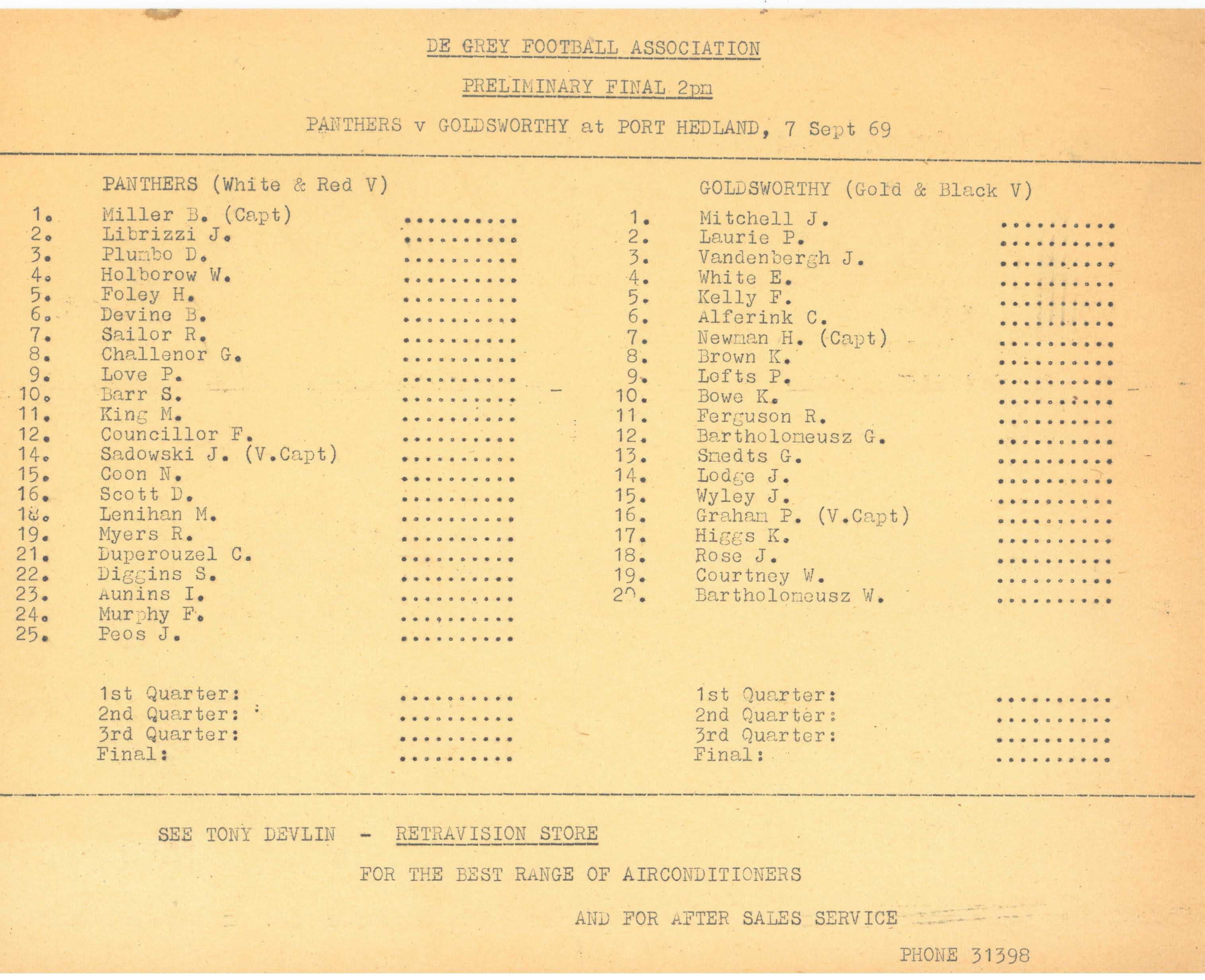 Preliminary Final played on 7 September 1969 at Port Hedland between Panthers and Goldsworthy.