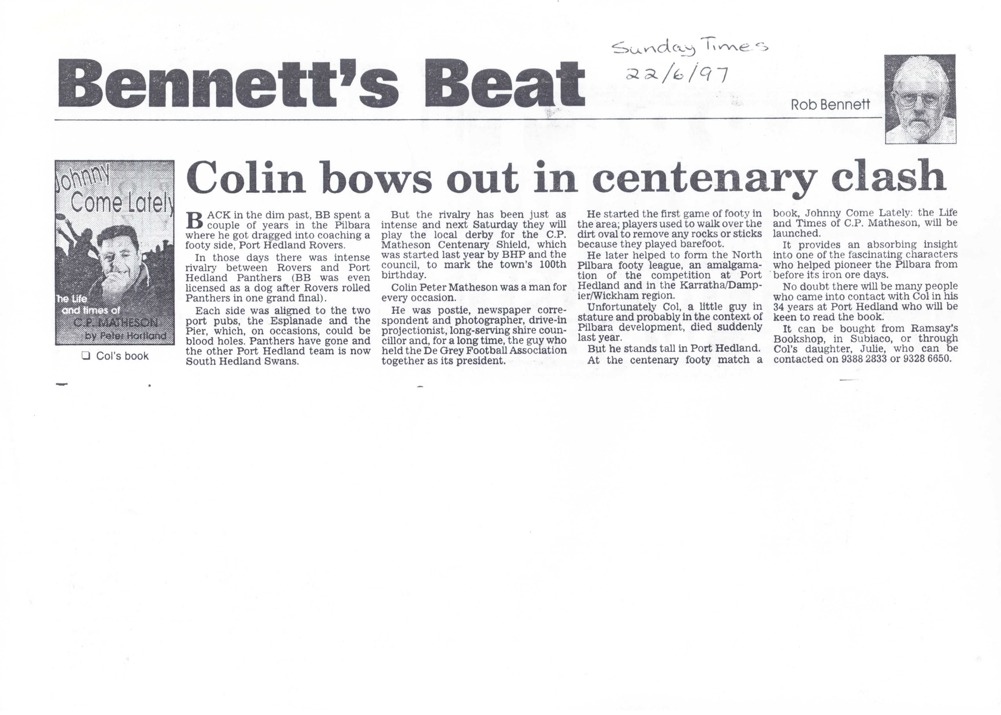 Robert Bennett (Bob) wrote an article about Colin in the Sunday Times and also his memories of football in the Pilbara.