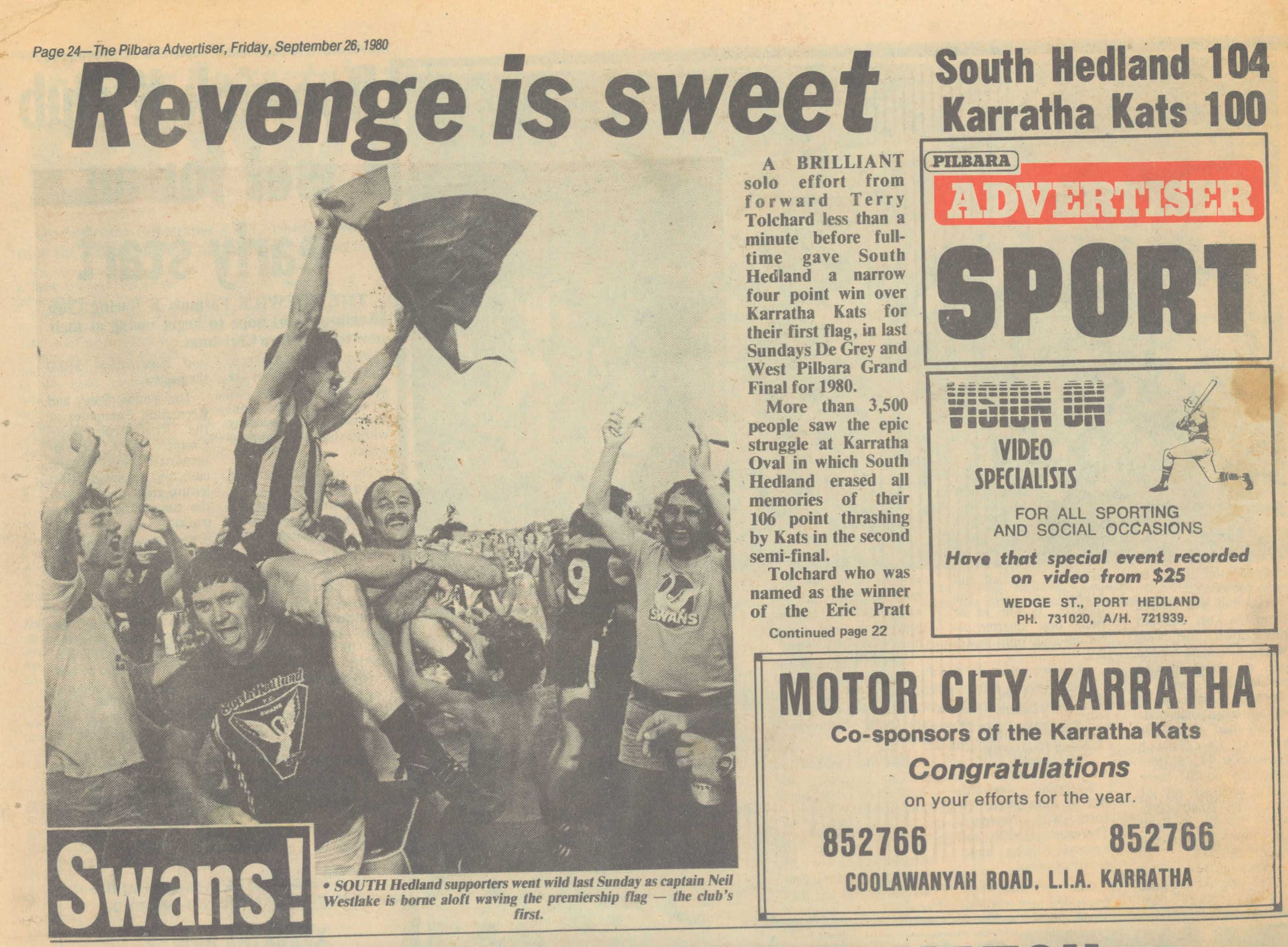 A brilliant solo effort from forward Terry Tolchard less than a minute before full-time gave South Hedland a narrow four point victory over Karratha Kats for the first flag in the De Grey and west Pilbara Grand Final for 1980.