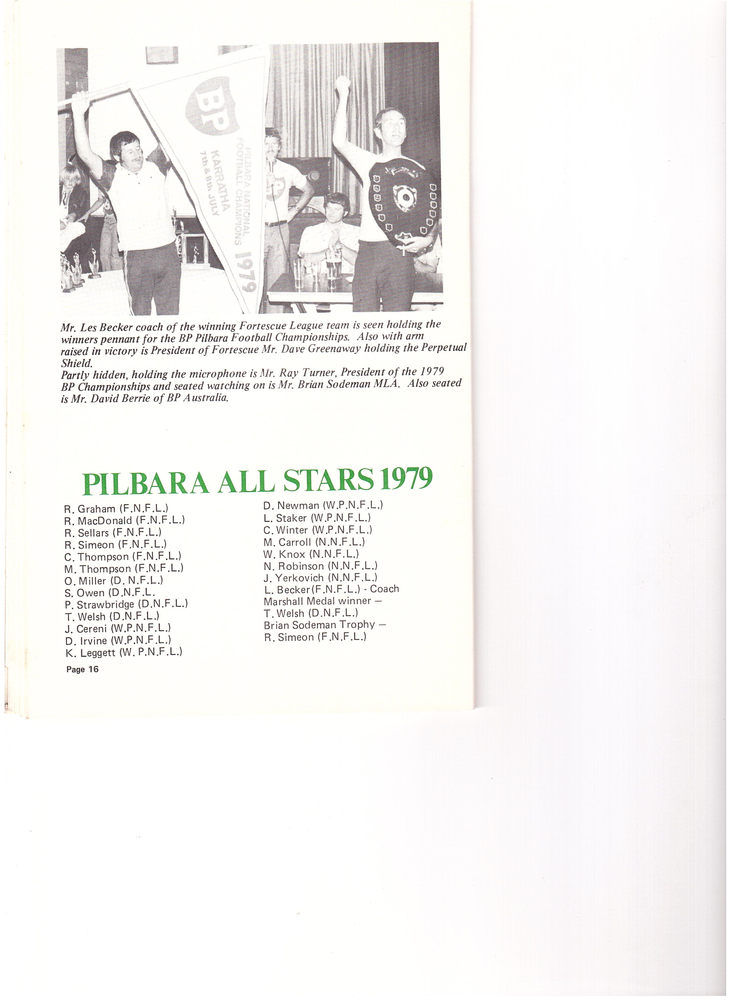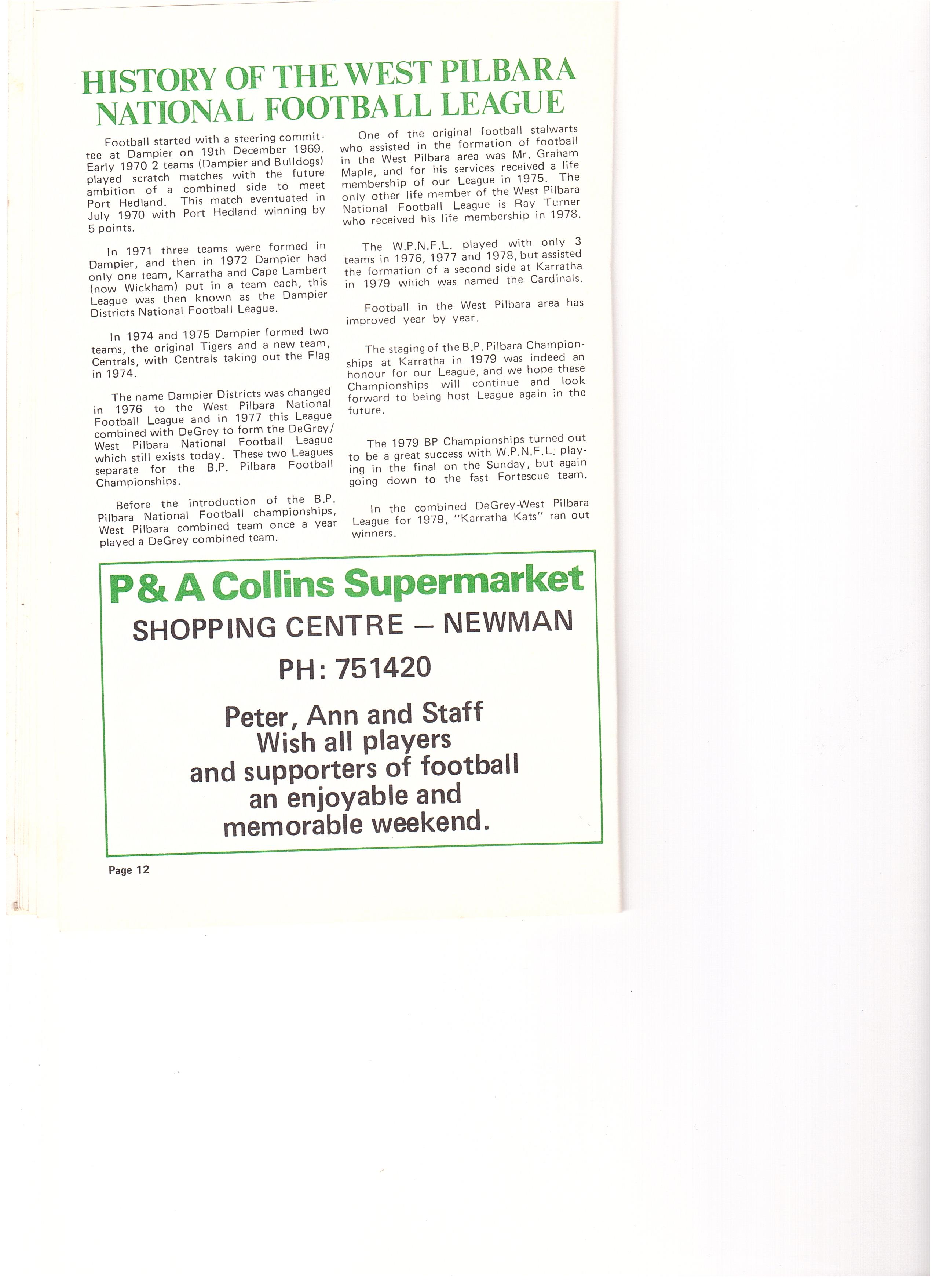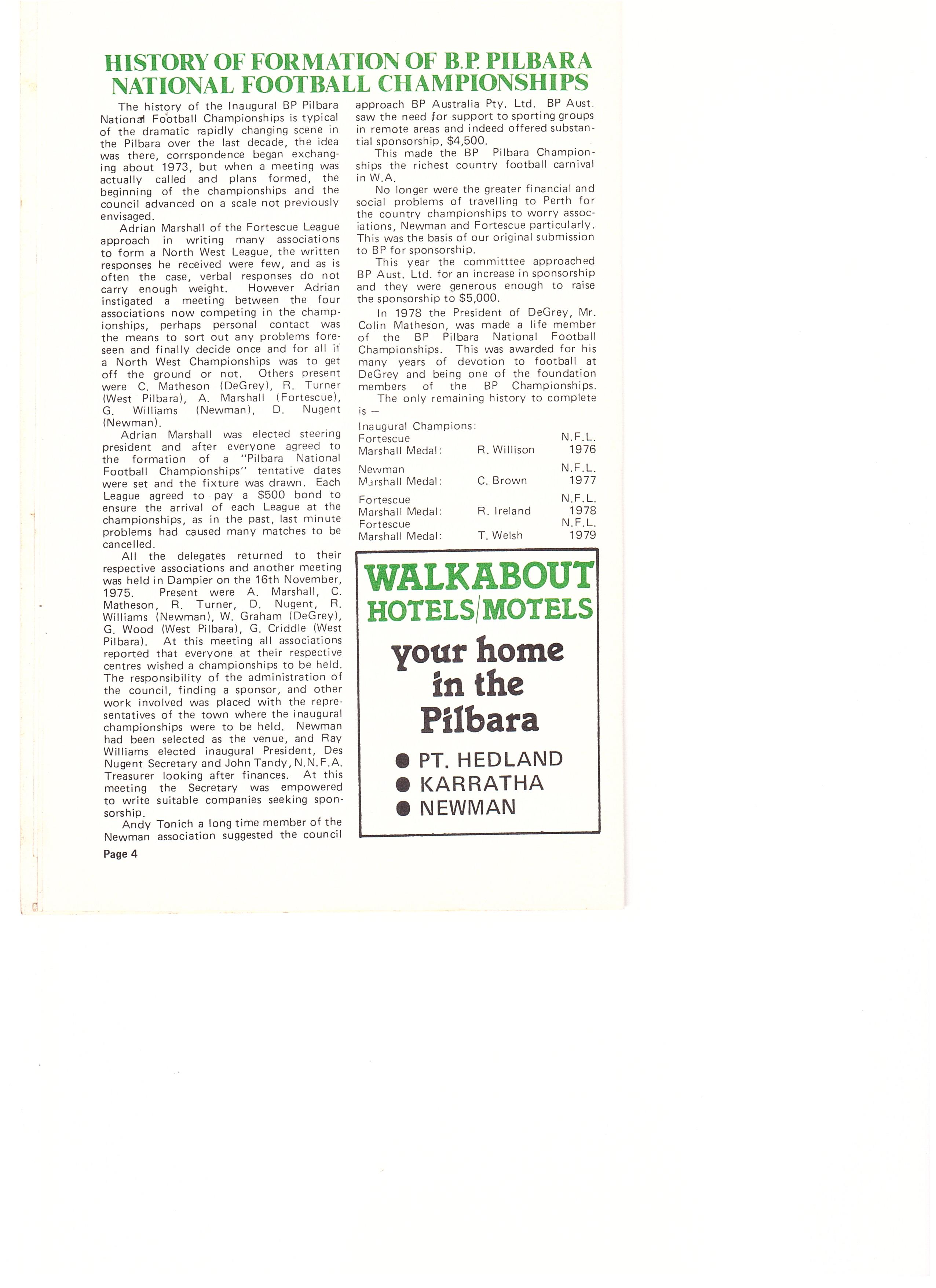 The history of the Inaugural BP Pilbara National Football Championships is typical of the dramatic rapidly changing scene in the Pilbara over the last decade, the idea was there, correspondence began exchanging about 1973, but when a meeting was actually called and plans formed, the beginning of the championships and council advanced on a scale not previously envisaged.
