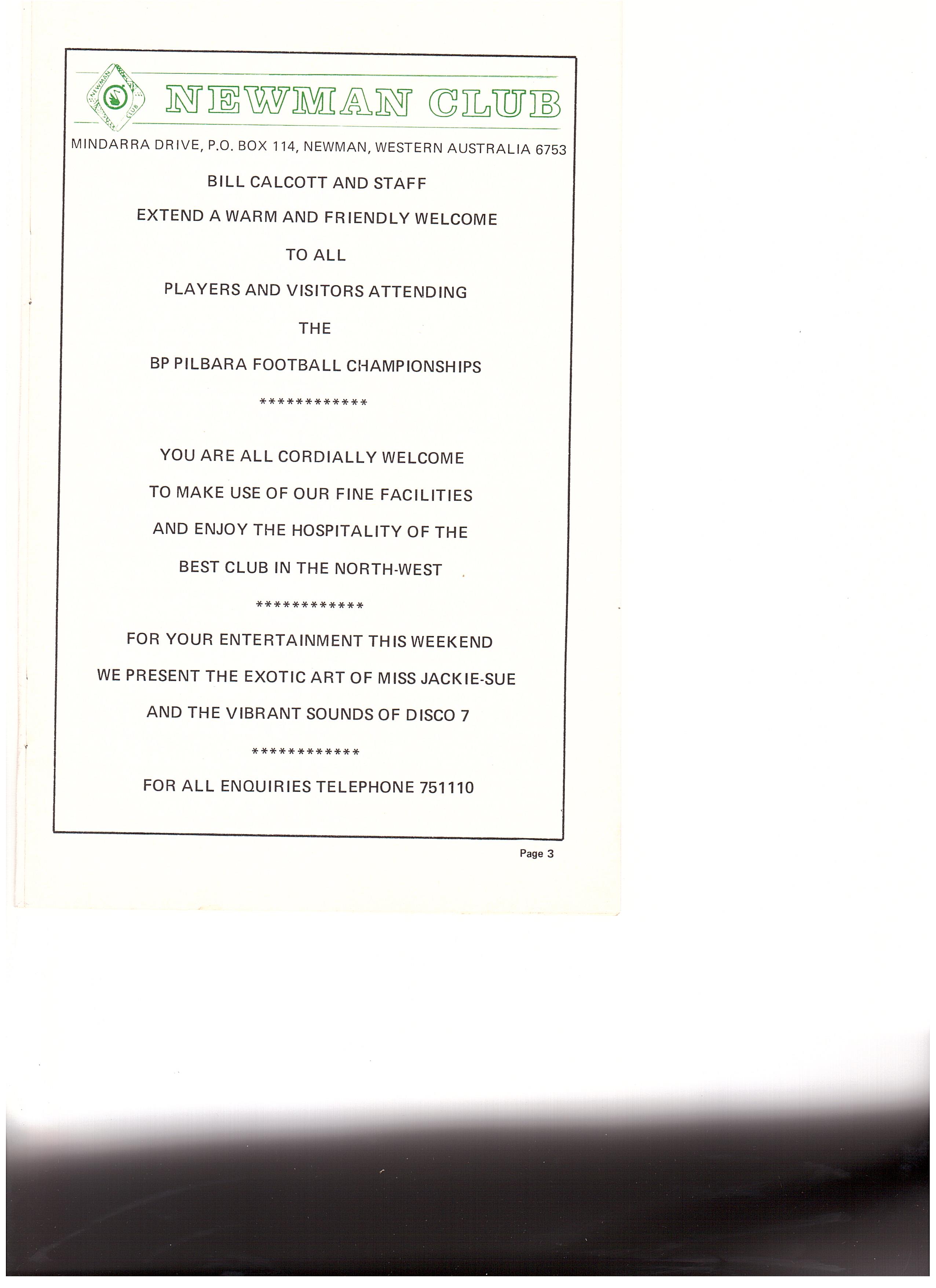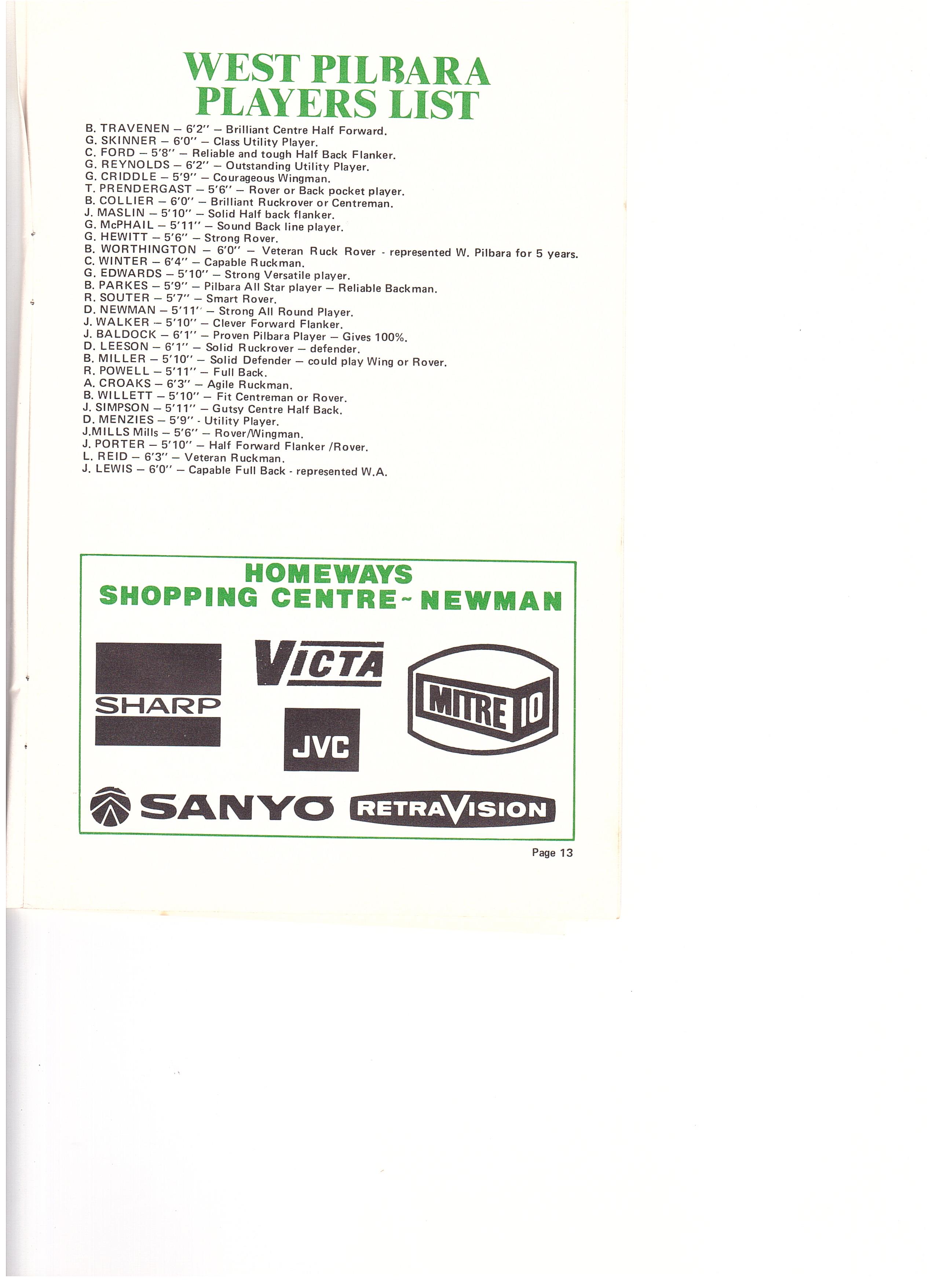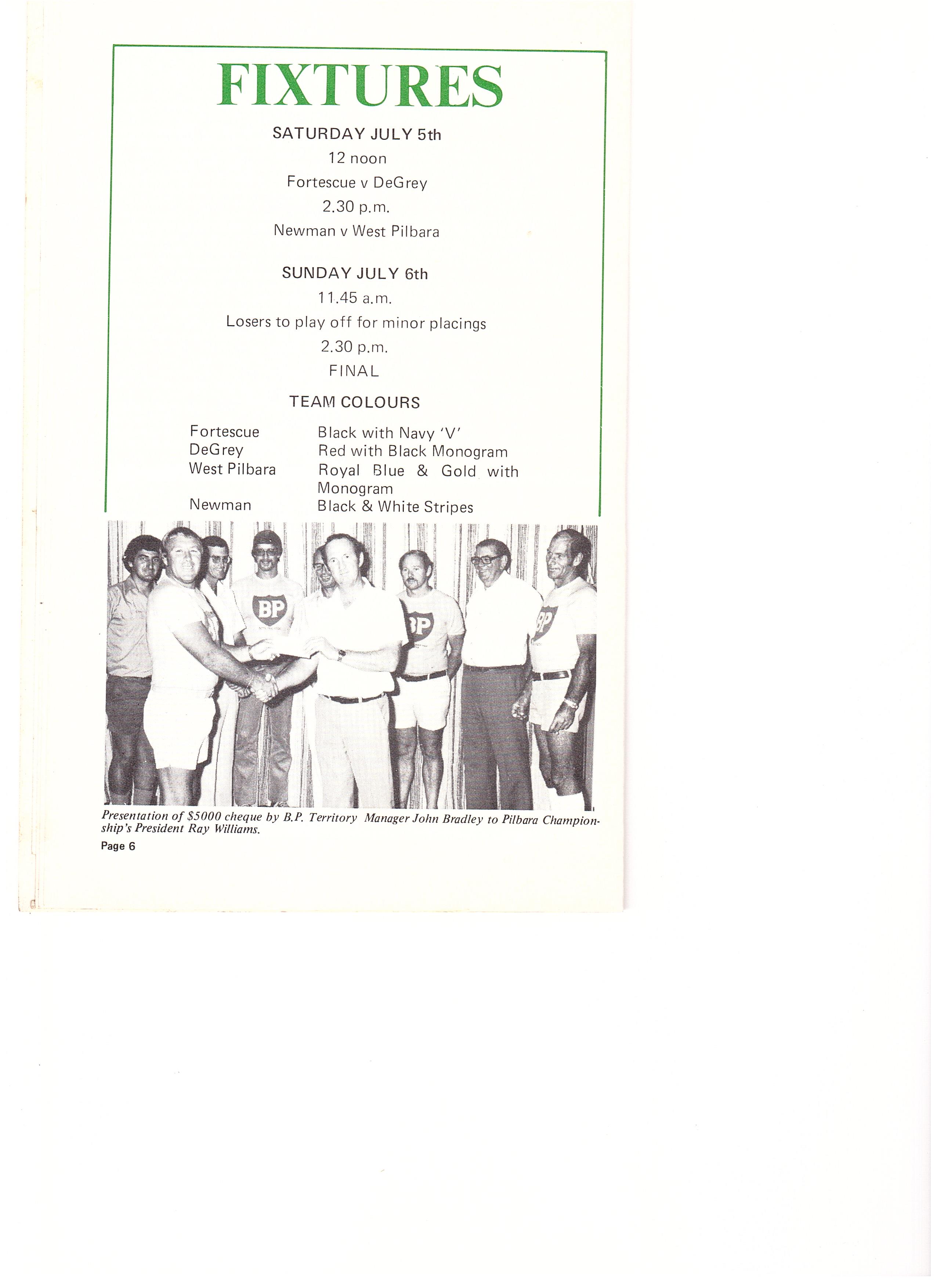 Adrian Marshall of the Fortescue League approached in writing many associations to form a North West League, the written responses were few, and as it is often the case, verbal responses do not carry enough weight. However, Adrian instigated a meeting between the four associations now competing in the championships, perhaps personal contact was the means to sort out any problems foreseen and finally decided once and for all a North West Championships was to get off the ground or not. Others present were Colin Matheson (DeGrey), Ray Turner (West Pilbara), Adrian Marshall (Fortescue), G Williams (Newman), D Nugent (Newman).