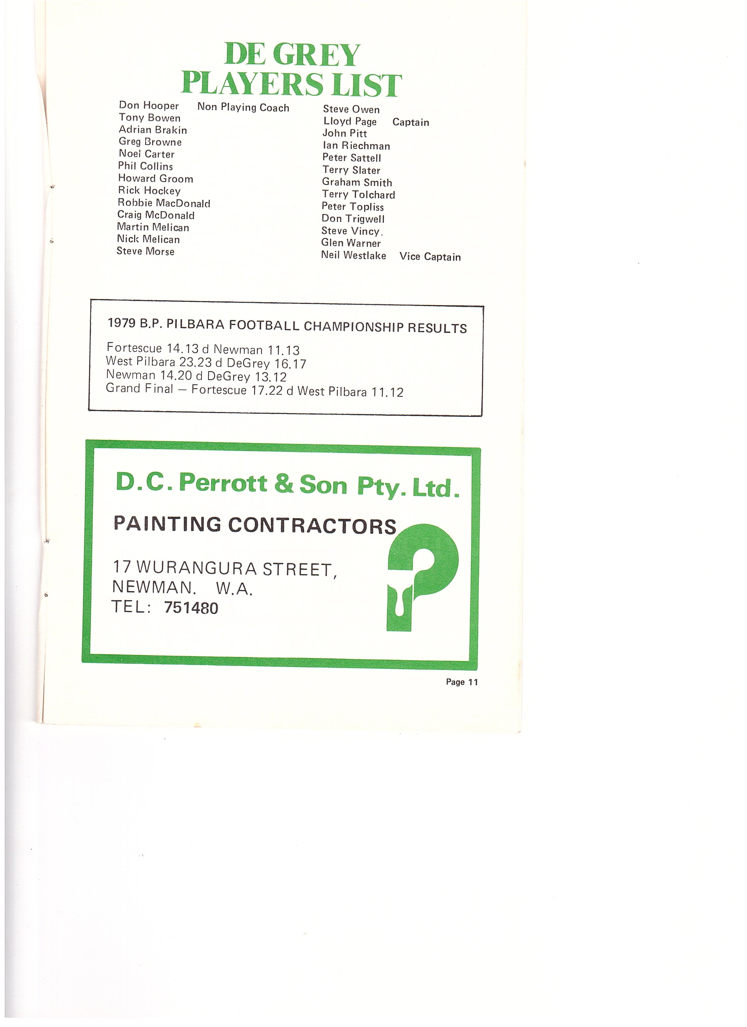 De Grey’s 1980 team was made up of: Don Hooper (Coach), Tony Bowen, Adrian Brakin, Greg Browne, Noel Carter, Phil Collins, Howard Groom, Rick Hockey, Robbie MacDonald, Craig McDonald, Martin Melican, Nick Melican, Steve Morse, Steve Owen, Lloyd Page (Captain), John Pitt, Bob Cross, Peter Sattell, Terry Slater, Graham Smith, Terry Tolchard, Peter Topliss, Don Trigwell, Steve Vincy, Glen Warner, Neil Westlake (Vice Captain)